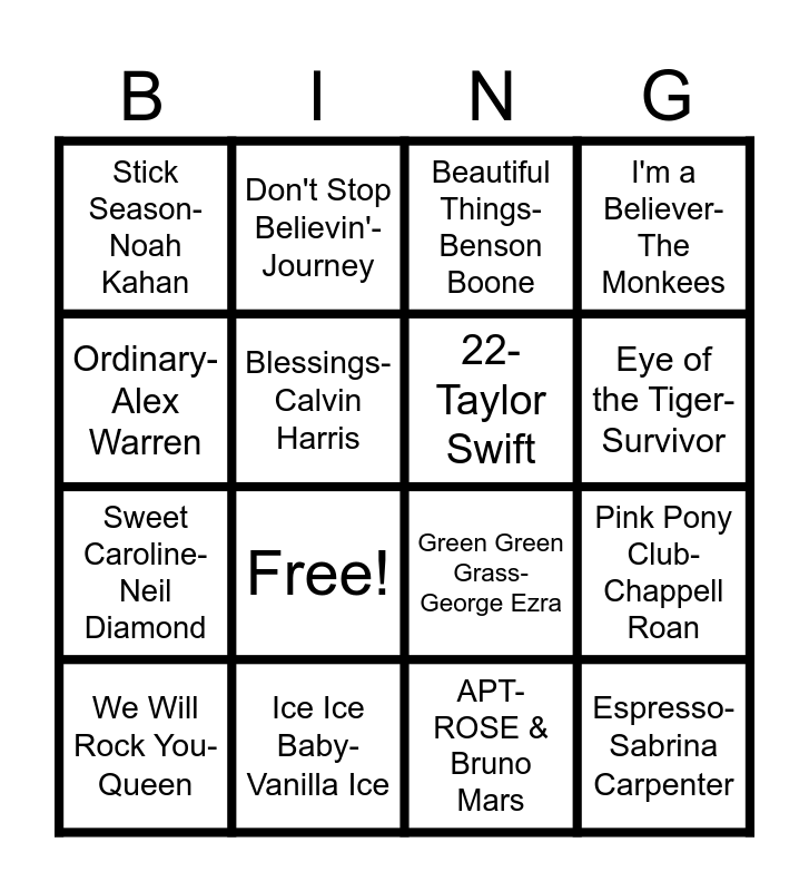 This bingo card has 18 words: Free!, Espresso-Sabrina Carpenter, Beautiful Things-Benson Boone, Stick Season-Noah Kahan, Green Green Grass-George Ezra, I'm a Believer-The Monkees, We Will Rock You- Queen, Don't Stop Believin'- Journey, Eye of the Tiger- Survivor, Sweet Caroline- Neil Diamond, APT- ROSE & Bruno Mars, Ordinary-Alex Warren, Pink Pony Club- Chappell Roan, Blessings- Calvin Harris, 22-Taylor Swift, Does Your Mother Know-ABBA, Ice Ice Baby- Vanilla Ice and Macarena-Los Del Rio.