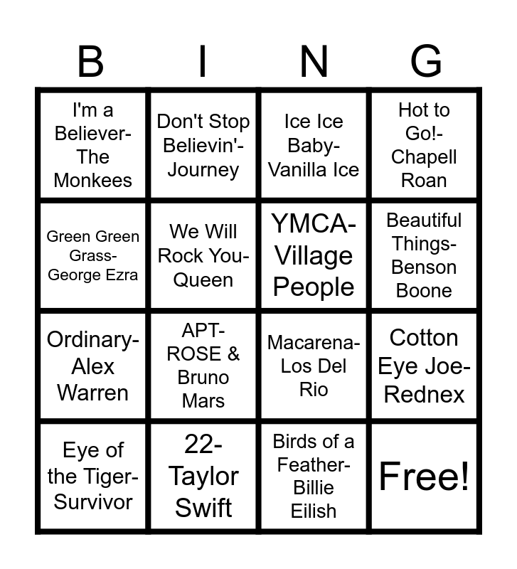This bingo card has 23 words: Free!, Espresso-Sabrina Carpenter, Beautiful Things-Benson Boone, Stick Season-Noah Kahan, Green Green Grass-George Ezra, I'm a Believer-The Monkees, We Will Rock You- Queen, Don't Stop Believin'- Journey, Eye of the Tiger- Survivor, Sweet Caroline- Neil Diamond, APT- ROSE & Bruno Mars, Ordinary-Alex Warren, Pink Pony Club- Chappell Roan, Blessings- Calvin Harris, 22-Taylor Swift, Does Your Mother Know-ABBA, Ice Ice Baby- Vanilla Ice, Macarena-Los Del Rio, YMCA- Village People, Cotton Eye Joe-Rednex, Hot to Go!- Chapell Roan, Birds of a Feather- Billie Eilish and I Had Some Help-Post Malone.