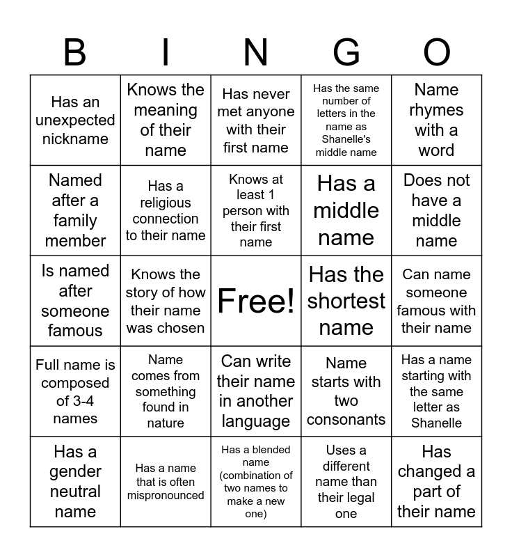 This bingo card has a free space and 24 words: Name comes from something found in nature, Has a name that is often mispronounced, Knows at least 1 person with their first name, Has a gender neutral name, Name rhymes with a word, Has an unexpected nickname, Named after a family member, Knows the meaning of their name, Has the shortest name, Can write their name in another language, Has a middle name, Is named after someone famous, Name starts with two consonants, Has a name starting with the same letter as Shanelle, Has a religious connection to their name, Uses a different name than their legal one, Can name someone famous with their name, Has never met anyone with their first name, Does not have a middle name, Knows the story of how their name was chosen, Has changed a part of their name, Full name is composed of 3-4 names, Has the same number of letters in the name as Shanelle's middle name and Has a blended name (combination of two names to make a new one).