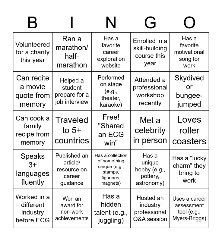 This bingo card has a free space and 36 words: Has facilitated a career talk this year, Holds a certification in career coaching, Mentored a student for 1+ years, Attended a professional workshop recently, Uses a career assessment tool (e.g., Myers-Briggs), Worked in a different industry before ECG, Published an article/ resource on career guidance, Has a "go-to" quote about career growth, Enrolled in a skill-building course this year, Helped a student discover a new career path, Speaks 3+ languages fluently, Traveled to 5+ countries, Plays a musical instrument, Loves roller coasters, Can cook a family recipe from memory, Ran a marathon/ half-marathon, Has a hidden talent (e.g., juggling), Met a celebrity in person, Skydived or bungee-jumped, Volunteered for a charity this year, Won an award for non-work achievements, Performed on stage (e.g., theater, karaoke), Has a unique hobby (e.g., pottery, astronomy), Has a pet named after a historical figure, Organized a workplace learning journey visit, Helped a student prepare for a job interview, Has a favorite career exploration website, Attended an ECG conference or seminar, Has a favorite motivational song for work, Can recite a movie quote from memory, Has tried an unusual food recently, Has a collection of something unique (e.g., stamps, figurines, magnets), Hosted an industry professional Q&A session, Has a "lucky charm" they bring to work, Knows a magic trick or card shuffle and Has a signature dance move at events.