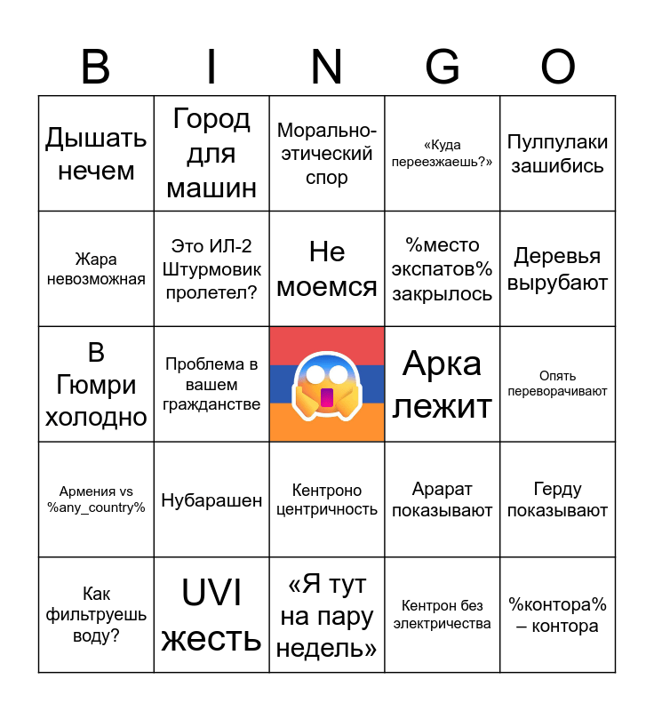 This bingo card has a free space and 24 words: Нубарашен, UVI жесть, Не моемся, Как фильтруешь воду?, Пулпулаки зашибись, Дышать нечем, Жара невозможная, Город для машин, Арка лежит, Кентроно центричность, %место экспатов% закрылось, В Гюмри холодно, Арарат показывают, Герду показывают, Это ИЛ-2 Штурмовик пролетел?, Кентрон без электричества, Опять переворачивают, Морально-этический спор, Деревья вырубают, Проблема в вашем гражданстве, %контора% – контора, Армения vs %any_country%, «Куда переезжаешь?» and «Я тут на пару недель».