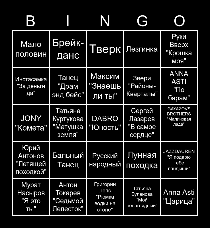 This bingo card has 2 images, a free space and 49 words: Серебро "Между нами любовь", Anna Asti "Царица", ВОГ, Григорий Лепс "Рюмка водки на столе", Бальный Танец, Женя Трофимов "Поезда", Брейк-данс, Андрей Губин "Ночь", Инстасамка "За деньги да", Blizkey "Горы", Танец "Драм энд бейс", Лезгинка, JAZZDAUREN "Я подарю тебе ландыши", Лунная походка, Валентин Стрыкало "Наше лето", Ласковый май "Седая ночь", Максим "Знаешь ли ты", Сергей Лазарев "В самое сердце", Стас Михайлов "Все для тебя", Руки Вверх "Крошка моя", Татьяна Куртукова "Матушка земля", Татьяна Буланова "Мой ненаглядный", Мало половин, Звери "Районы-Кварталы", Леприконсы "Хали Гали", ANNA ASTI "По барам", Мурат Насыров "Я это ты", Леонид Агутин "Хоп хей лалалей", Русский народный, Юрий Антонов "Летящей походкой", Жуки "Батарейка", Руки Вверх "18 мне уже", Иванушки "Тополиный пух", Single Ladies, Антон Токарев "Седьмой Лепесток", Земляне "Трава у дома", Танец Мигеля, Валерий Меладзе "Салют Вера", GAYAZOVS BROTHERS "Малиновая лада", Чичерина "Ту ту ла ту лула", Танец робота, Михаил Шуфутинский "Марджанджа", Султан Лугачев "Горький вкус", Андрей Губин "Зима холода", JONY "Комета", Тверк, Тектоник, Чечетка and ZDOB SI ZDUB "Видели ночь".