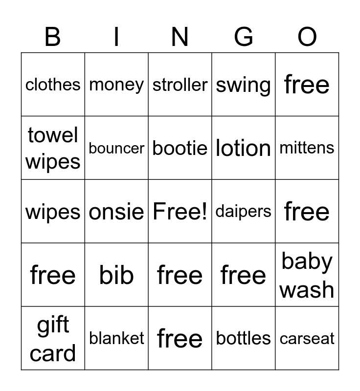 This bingo card has a free space and 25 words: bib, free, bootie, gift card, free, clothes, towel wipes, money, daipers, free, lotion, wipes, free, baby wash, bouncer, free, free, stroller, mittens, onsie, carseat, blanket, free, swing and bottles.