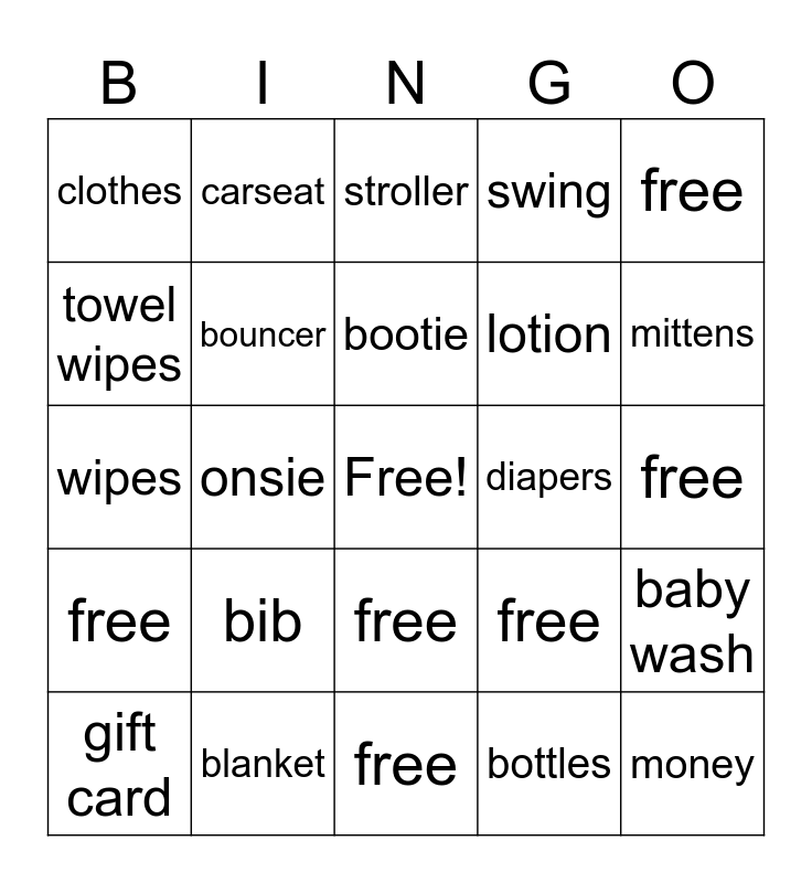 This bingo card has a free space and 25 words: bib, free, bootie, gift card, free, clothes, towel wipes, carseat, diapers, free, lotion, wipes, free, baby wash, bouncer, free, free, stroller, mittens, onsie, money, blanket, free, swing and bottles.