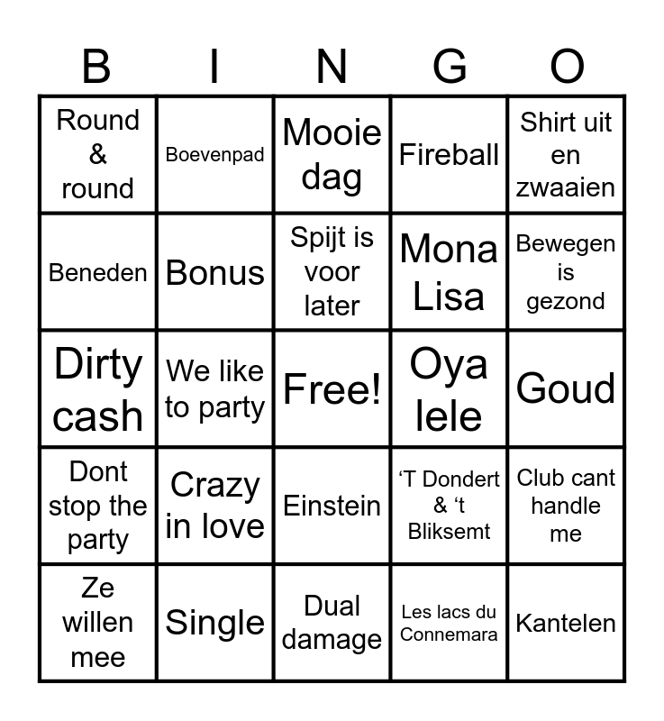 This bingo card has a free space and 153 words: Baila de Gasolina, Mannenhart, ‘T Dondert & ‘t Bliksemt, Waarom nou niet (Kleuren), Per spoor (Kedeng kendeng), Macarena, Cotton eye joe, Zaazaa, Ordinary, Atlas, Echt liefde is te koop, Lotje, Mona Lisa, Beetje van mij, Goud, Shirt uit en zwaaien, Blikkendag, Gaan we weg, Ik haat hem voor jou, Rather be, Een zomeravond, Als de morgen is gekomen, Tranquilo, Atje voor de sfeer, Twee emmertjes, Woonboot, Les lacs du Connemara, Dont stop the party, Hot n cold, Entourage, Max verstappen, Even aan mn moeder vragen, Zoet zout zuur, In de naam van …, Say my name, Traag, Mundian to be kach, Starships, Kali, Someone like you, Cant hold us, Year of summer, Oya lele, Life is a highway, Sweet Caroline, Narcotic, Rolling in the deep, Borderline, King, Dansvloerkiller, Jungle, Bewegen is gezond, Schudden, Dont stop (wiggle wiggle), U can’t touch this, Dancing queen, Party rock, Unwritten, Alles kan kapot, 100%, Boevenpad, Terug in de tijd, Greenlight, Ome robert, Ushuaia, Fuifje, Crazy in love, Mag ik dansen, Shut up and dance, Best song ever, Baby, Sugardaddy, Single, Vergeten, Dance with somebody, We found love, Rosanne, Zolang je bij me bent, Vur welke club bende gij, 24k magic, Pokemon theme song, Kantelen, Country roads, We like to party, Bonus, Huisfeestje, Locked out of heaven, Who let the dog out, Ze willen mee, Round & round, Vette boeren, Dual damage, Viva cerveza, Als jij je vinger in mn kont steekt, Echte vrienden, The Glen, Lies, Ik zing, In de naam van…, Kernkraft 400, Blessings, Beneden, Jungle, Do or die, Zolang je bij me bent, Jouw blik, Laat de zon in je hart, Lion in the morning sun, Dance with somebody, Waka (noa lang), Waka waka (shakira), Sexy als ik dans, Mooie dag, Ik ga zwemmen, Say my name, Wackelcontact, Pretty girls, Niemand, Einstein, Feel this moment, Rocky your body, Casual, Hart in brand, Spijt is voor later, Vanavond (uit mn bol), Blijf je vanavond, Ik spaar geen centen, Dirty cash, Timber, Hold my hand, Fireball, Titanium, Call me maybe, Ai se eu te pego, No money, Counting stars, Lush life, King, Club cant handle me, Bloed zweet tranen, Brabant, Paddelen, Baby, Domino, Rather be, Krantenwijk, Loterij, Acid dream, Wild ones, Dynamite, La la la, Feel so close and Last friday night.