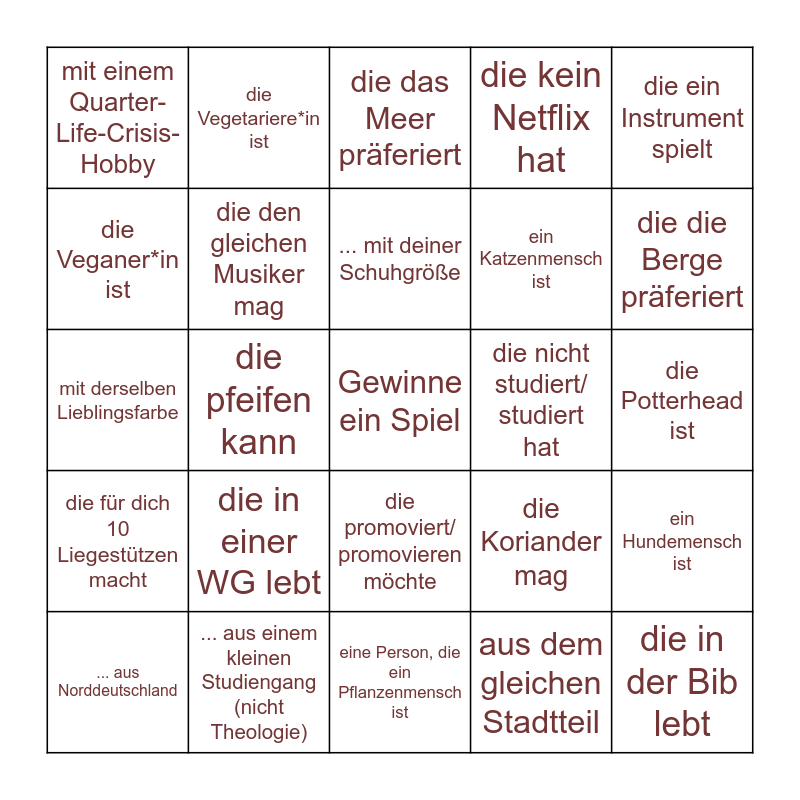 This bingo card has a free space and 24 words: die in einer WG lebt, ... aus einem kleinen Studiengang (nicht Theologie), ... mit deiner Schuhgröße, ... aus Norddeutschland, die ein Instrument spielt, mit einem Quarter-Life-Crisis-Hobby, die Veganer*in ist, die Vegetariere*in ist, die nicht studiert/ studiert hat, die promoviert/ promovieren möchte, ein Katzenmensch ist, mit derselben Lieblingsfarbe, die Koriander mag, ein Hundemensch ist, die den gleichen Musiker mag, aus dem gleichen Stadtteil, die Potterhead ist, die das Meer präferiert, die die Berge präferiert, die pfeifen kann, die in der Bib lebt, die für dich 10 Liegestützen macht, die kein Netflix hat and eine Person, die ein Pflanzenmensch ist.