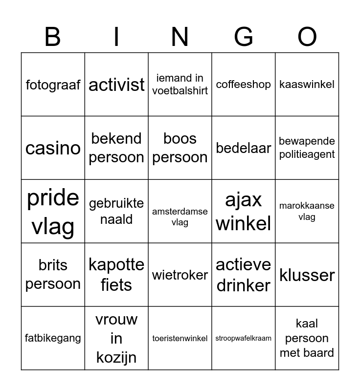 This bingo card has a free space and 24 words: fatbikegang, kapotte fiets, boos persoon, stroopwafelkraam, kaaswinkel, fotograaf, activist, iemand in voetbalshirt, ajax winkel, marokkaanse vlag, pride vlag, bekend persoon, actieve drinker, klusser, casino, vrouw in kozijn, toeristenwinkel, coffeeshop, bewapende politieagent, brits persoon, gebruikte naald, wietroker, bedelaar and kaal persoon met baard.