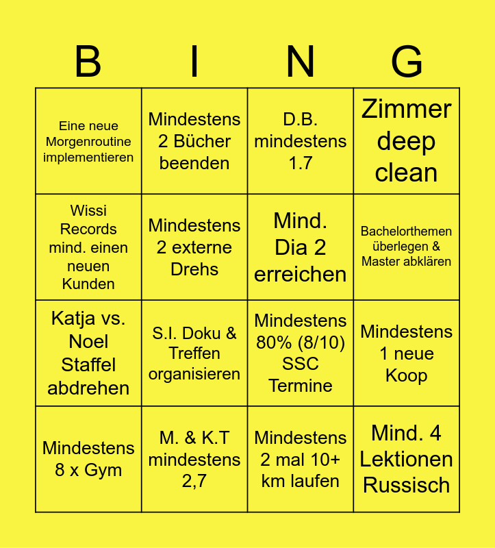 This bingo card has 16 words: M. & K.T mindestens 2,7, Mindestens 1 neue Koop, D.B. mindestens 1.7, Eine neue Morgenroutine implementieren, Katja vs. Noel Staffel abdrehen, Mindestens 2 Bücher beenden, Mindestens 80% (8/10) SSC Termine, Mindestens 2 mal 10+ km laufen, Wissi Records mind. einen neuen Kunden, Mindestens 2 externe Drehs, Mindestens 8 x Gym, Zimmer deep clean, S.I. Doku & Treffen organisieren, Bachelorthemen überlegen & Master abklären, Mind. Dia 2 erreichen and Mind. 4 Lektionen Russisch.
