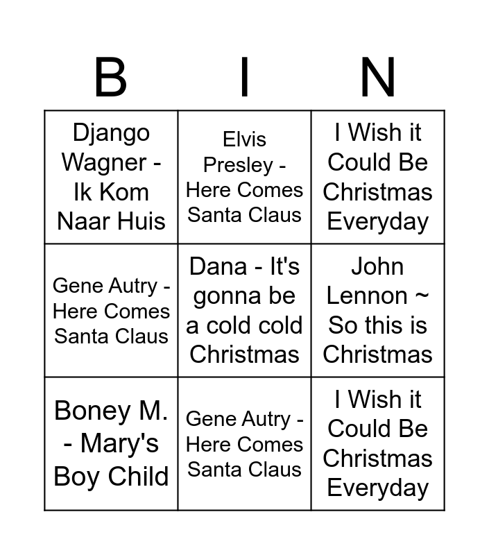 ⚠ This card has duplicate items: ABBA - Happy New Year (2), Andy Williams - It's the Most Wonderful Time of the Year (2), Amy Grant - Hark! The Herald Angels Sing (2), Elvis Presley, Martina McBride - Blue Christmas (2), Boney M. - Mary's Boy Child (2), Dana - It's gonna be a cold cold Christmas (2), Django Wagner - Ik Kom Naar Huis (2), Elvis Presley - Here Comes Santa Claus (2), Frank Sinatra - Let It Snow! Let It Snow! Let It Snow! (2), Gene Autry - Here Comes Santa Claus (2), I Wish it Could Be Christmas Everyday (2), John Lennon ~ So this is Christmas (2), José Feliciano - Feliz Navidad (2), Maria Kwam Er Te Bethlehem Aan (2), Band Aid - Do They Know It's Christmas (2), Paul McCartney - We All Stand Together (2)