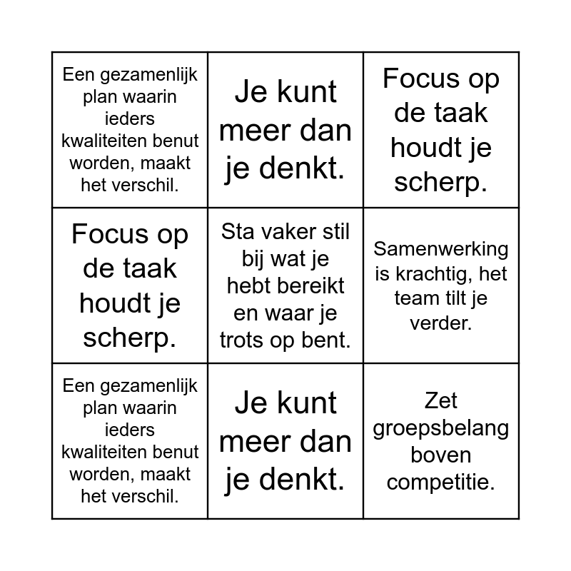⚠ This card has duplicate items: Zet groepsbelang boven competitie. (2), Hulp vragen en accepteren is essentieel. (2), Focus op de taak houdt je scherp. (2), Een gezamenlijk plan waarin ieders kwaliteiten benut worden, maakt het verschil. (2), Je kunt meer dan je denkt. (2)