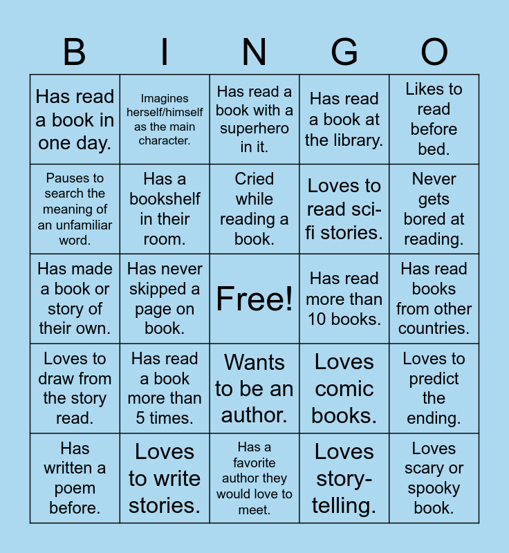 This bingo card has a free space and 24 words: Has read a book more than 5 times., Loves to write stories., Cried while reading a book., Has written a poem before., Likes to read before bed., Has read a book in one day., Pauses to search the meaning of an unfamiliar word., Imagines herself/himself as the main character., Has read more than 10 books., Wants to be an author., Loves to read sci-fi stories., Has made a book or story of their own., Loves comic books., Loves to predict the ending., Has a bookshelf in their room., Loves story-telling., Has read books from other countries., Has read a book with a superhero in it., Never gets bored at reading., Has never skipped a page on book., Loves scary or spooky book., Loves to draw from the story read., Has read a book at the library. and Has a favorite author they would love to meet..