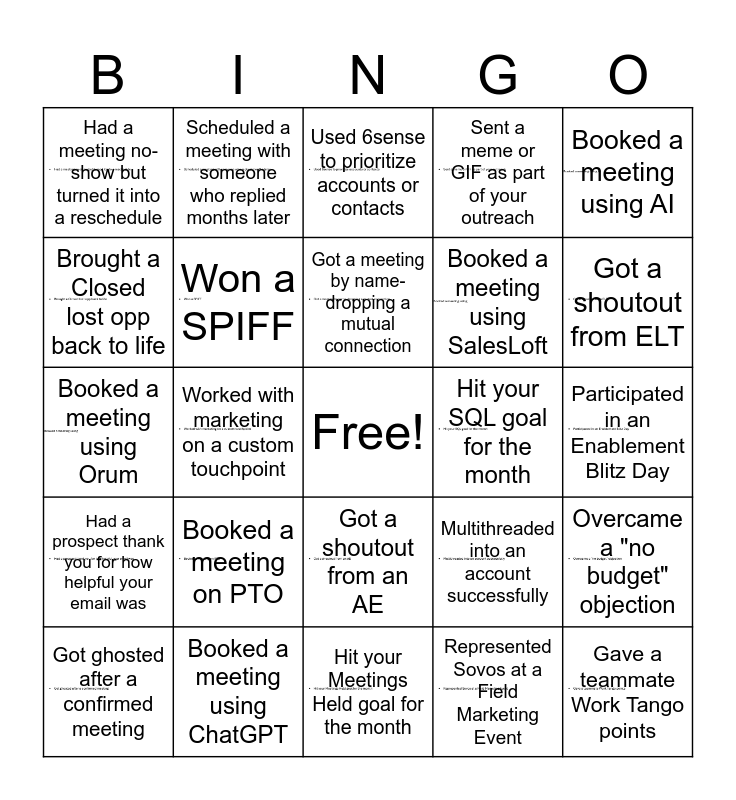 This bingo card has 23 images, a free space and 24 words: Got ghosted after a confirmed meeting, Booked a meeting on PTO, Got a meeting by name-dropping a mutual connection, Represented Sovos at a Field Marketing Event, Booked a meeting using AI, Had a meeting no-show but turned it into a reschedule, Scheduled a meeting with someone who replied months later, Used 6sense to prioritize accounts or contacts, Hit your SQL goal for the month, Participated in an Enablement Blitz Day, Booked a meeting using Orum, Won a SPIFF, Multithreaded into an account successfully, Overcame a "no budget" objection, Brought a Closed lost opp back to life, Booked a meeting using ChatGPT, Hit your Meetings Held goal for the month, Sent a meme or GIF as part of your outreach, Got a shoutout from ELT, Had a prospect thank you for how helpful your email was, Worked with marketing on a custom touchpoint, Got a shoutout from an AE, Booked a meeting using SalesLoft and Gave a teammate Work Tango points.