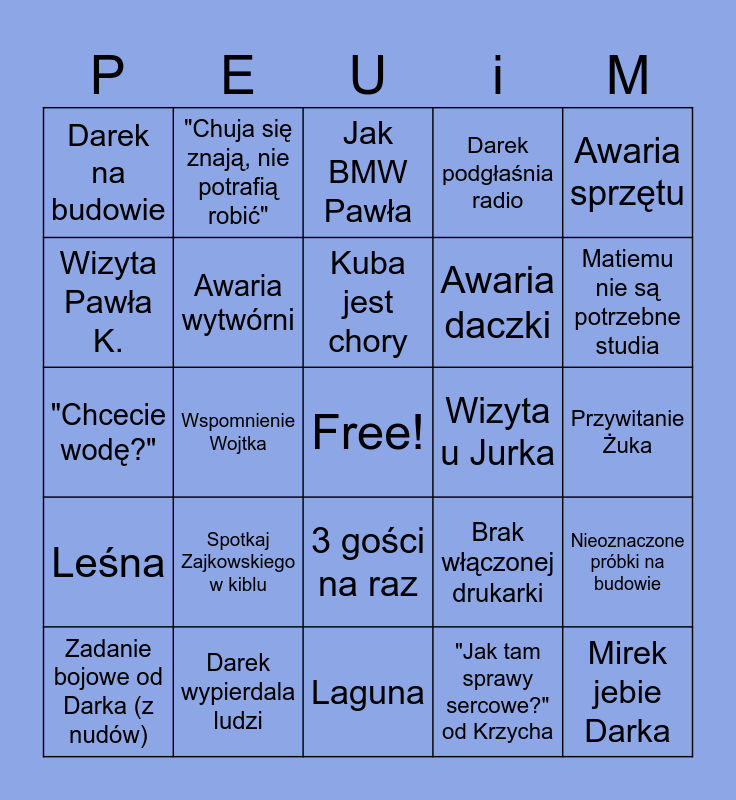 This bingo card has a free space and 24 words: Spotkaj Zajkowskiego w kiblu, Darek wypierdala ludzi, Kuba jest chory, Zadanie bojowe od Darka (z nudów), Awaria sprzętu, Darek na budowie, Wizyta Pawła K., "Chuja się znają, nie potrafią robić", Wizyta u Jurka, 3 gości na raz, Awaria daczki, "Chcecie wodę?", Brak włączonej drukarki, Nieoznaczone próbki na budowie, Awaria wytwórni, "Jak tam sprawy sercowe?" od Krzycha, Przywitanie Żuka, Jak BMW Pawła, Matiemu nie są potrzebne studia, Wspomnienie Wojtka, Mirek jebie Darka, Leśna, Darek podgłaśnia radio and Laguna.