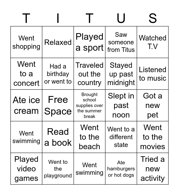 This bingo card has 25 words: Read a book, Went swimming, Traveled out the country, Played video games, Watched T.V, Went shopping, Went to a concert, Relaxed, Slept in past noon, Went to the beach, Stayed up past midnight, Ate ice cream, Went to a different state, Went to the movies, Had a birthday or went to, Tried a new activity, Got a new pet, Played a sport, Listened to music, Free Space, Brought school supplies over the summer break, Went to the playground, Went swimming, Saw someone from Titus and Ate hamburgers or hot dogs.