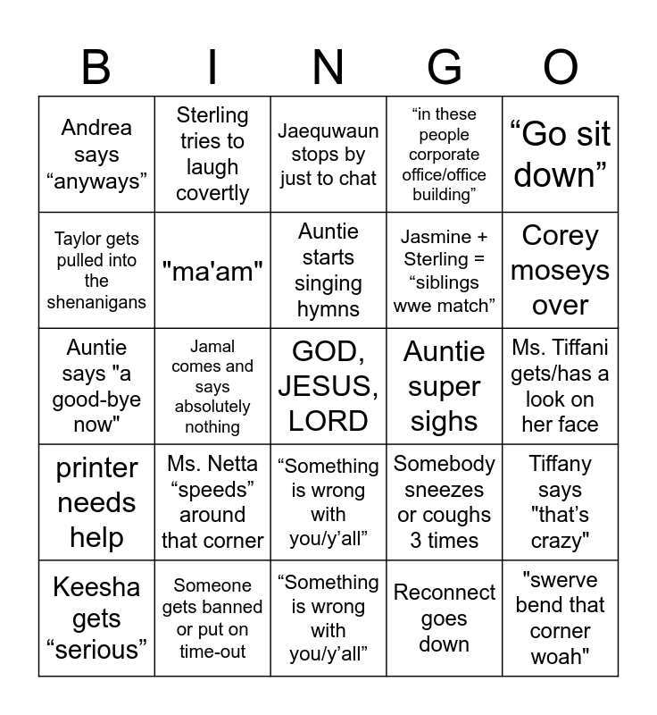 This bingo card has a free space and 24 words: Ms. Netta “speeds” around that corner, Someone gets banned or put on time-out, Auntie starts singing hymns, Keesha gets “serious”, “Go sit down”, Andrea says “anyways”, Taylor gets pulled into the shenanigans, Sterling tries to laugh covertly, Auntie super sighs, “Something is wrong with you/y’all”, Jasmine + Sterling = “siblings wwe match”, Auntie says "a good-bye now", Somebody sneezes or coughs 3 times, Tiffany says "that’s crazy", "ma'am", Reconnect goes down, Ms. Tiffani gets/has a look on her face, Jaequwaun stops by just to chat, Corey moseys over, Jamal comes and says absolutely nothing, "swerve bend that corner woah", printer needs help, “in these people corporate office/office building” and “Something is wrong with you/y’all”.