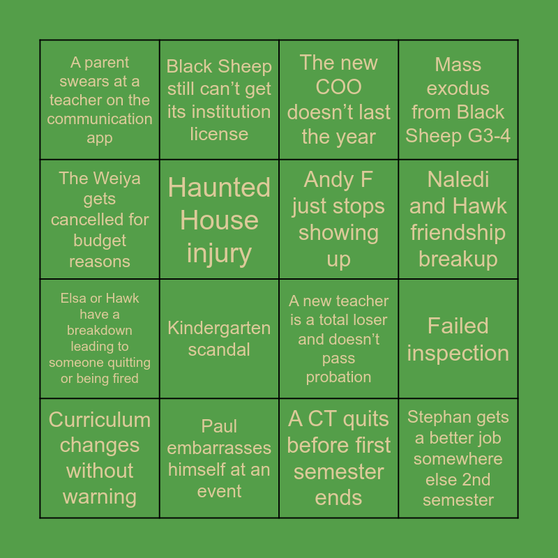 This bingo card has 16 words: Curriculum changes without warning, Paul embarrasses himself at an event, The new COO doesn’t last the year, Mass exodus from Black Sheep G3-4, The Weiya gets cancelled for budget reasons, Black Sheep still can’t get its institution license, A new teacher is a total loser and doesn’t pass probation, Failed inspection, A parent swears at a teacher on the communication app, Haunted House injury, A CT quits before first semester ends, Naledi and Hawk friendship breakup, Elsa or Hawk have a breakdown leading to someone quitting or being fired, Kindergarten scandal, Andy F just stops showing up and Stephan gets a better job somewhere else 2nd semester.