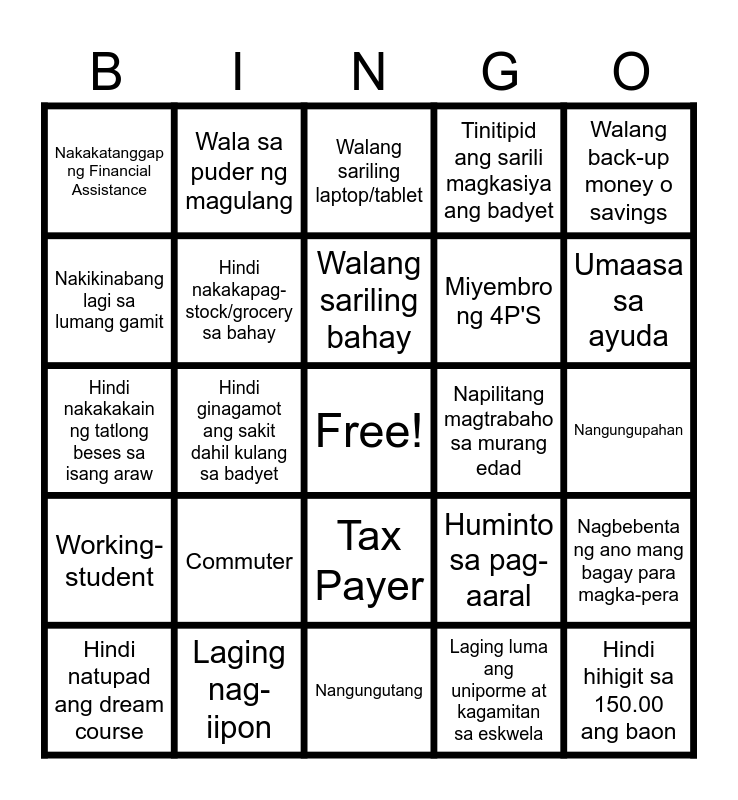 This bingo card has a free space and 24 words: Commuter, Laging nag-iipon, Walang sariling bahay, Hindi natupad ang dream course, Walang back-up money o savings, Nakakatanggap ng Financial Assistance, Nakikinabang lagi sa lumang gamit, Wala sa puder ng magulang, Napilitang magtrabaho sa murang edad, Tax Payer, Miyembro ng 4P'S, Hindi nakakakain ng tatlong beses sa isang araw, Huminto sa pag-aaral, Nagbebenta ng ano mang bagay para magka-pera, Hindi nakakapag-stock/grocery sa bahay, Laging luma ang uniporme at kagamitan sa eskwela, Nangungupahan, Walang sariling laptop/tablet, Umaasa sa ayuda, Hindi ginagamot ang sakit dahil kulang sa badyet, Hindi hihigit sa 150.00 ang baon, Working-student, Tinitipid ang sarili magkasiya ang badyet and Nangungutang.