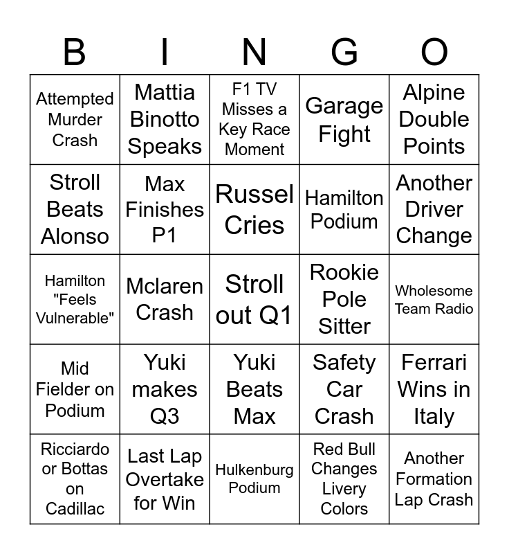 This bingo card has a free space and 24 words: Yuki makes Q3, Last Lap Overtake for Win, Russel Cries, Ricciardo or Bottas on Cadillac, Alpine Double Points, Attempted Murder Crash, Stroll Beats Alonso, Mattia Binotto Speaks, Rookie Pole Sitter, Yuki Beats Max, Hamilton Podium, Hamilton "Feels Vulnerable", Safety Car Crash, Ferrari Wins in Italy, Max Finishes P1, Red Bull Changes Livery Colors, Wholesome Team Radio, F1 TV Misses a Key Race Moment, Another Driver Change, Mclaren Crash, Another Formation Lap Crash, Mid Fielder on Podium, Garage Fight and Hulkenburg Podium.