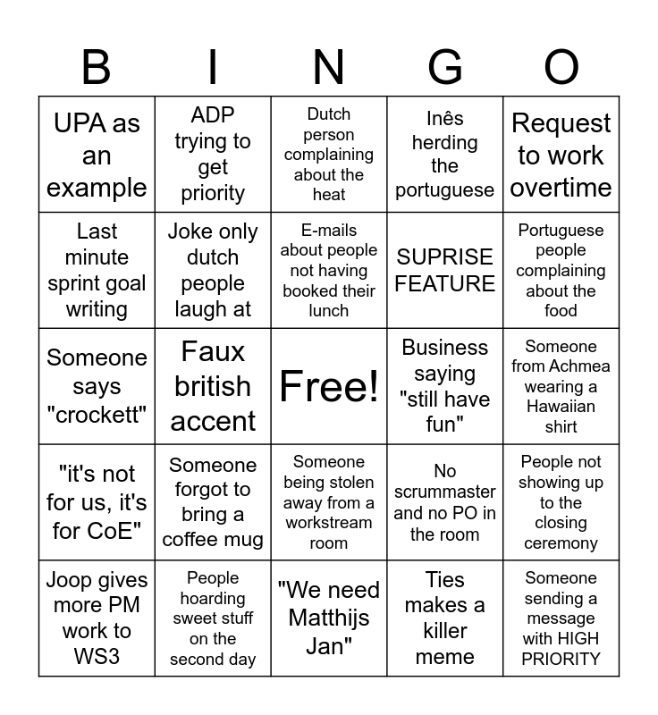 This bingo card has a free space and 34 words: Dutch saying that doesn't translate well into English, Unnecessary effects on the Achmea PowerPoint, Shared screen with more than 32 tabs open, Miro board mistake, Someone from Achmea wearing a Hawaiian shirt, Last minute sprint goal writing, Joke only dutch people laugh at, "We need Matthijs Jan", SUPRISE FEATURE, Someone sending a message with HIGH PRIORITY, Someone says "crockett", ADP trying to get priority, Ties makes a killer meme, Accidentally entering a Teams meeting with two microphones, "it's not for us, it's for CoE", Faux british accent, Someone being stolen away from a workstream room, Business saying "still have fun", People not showing up to the closing ceremony, Joop gives more PM work to WS3, People hoarding sweet stuff on the second day, Lying about confidence vote, Inês herding the portuguese, Portuguese people complaining about the food, Number count on teams chat notifs more than 6, Someone forgot to bring a coffee mug, Dutch person complaining about the heat, "It's outside of this Train", Request to work overtime, UPA as an example, D81 takes a lot of analysis time, E-mails about people not having booked their lunch, No scrummaster and no PO in the room and "We have learned from our mistakes".