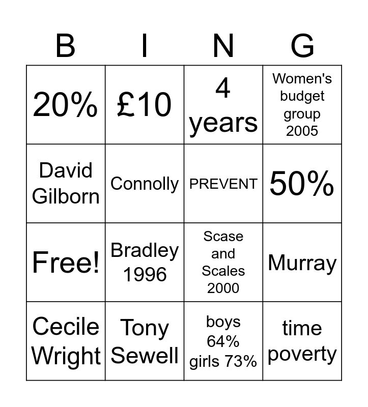 This bingo card has 1 images and 19 words: Murray, Labelling theory, 4 years, Cecile Wright, David Gilborn, Tony Sewell, 20%, Free!, £10, Bradley 1996, Scase and Scales 2000, Connolly, time poverty, PREVENT, Rauch, 50%, Women's budget group 2005, boys 64% girls 73% and x3.