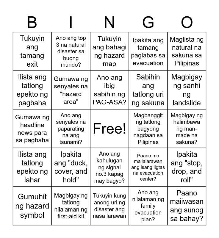 This bingo card has a free space and 24 words: Ipakita ang "duck, cover, and hold", Magbigay ng tatlong nilalaman ng first-aid kit, Ano ang ibig sabihin ng PAG-ASA?, Gumuhit ng hazard symbol, Maglista ng natural na sakuna sa Pilipinas, Tukuyin ang tamang exit, Ilista ang tatlong epekto ng pagbaha, Ano ang top 3 na natural disaster sa buong mundo?, Magbanggit ng tatlong bagyong nagdaan sa Pilipinas, Ano ang kahulugan ng signal no.3 kapag may bagyo?, Sabihin ang tatlong uri ng sakuna, Gumawa ng headline news para sa pagbaha, Paano mo mailalarawan ang isang ligtas na evacuation center?, Ipakita ang "stop, drop, and roll", Gumawa ng senyales na "hazard area", Ano ang nilalaman ng family evacuation plan?, Magbigay ng halimbawa ng man-made na sakuna?, Tukuyin ang bahagi ng hazard map, Magbigay ng sanhi ng landslide, Ano ang senyales na paparating na ang tsunami?, Paano maiiwasan ang sunog sa bahay?, Ilista ang tatlong epekto ng lahar, Ipakita ang tamang paglabas sa evacuation and Tukuyin kung anong uri ng disaster ang nasa larawan.