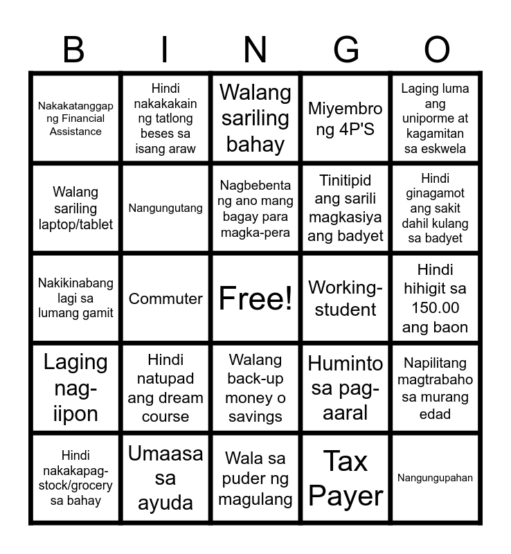 This bingo card has a free space and 24 words: Hindi natupad ang dream course, Umaasa sa ayuda, Nagbebenta ng ano mang bagay para magka-pera, Hindi nakakapag-stock/grocery sa bahay, Laging luma ang uniporme at kagamitan sa eskwela, Nakakatanggap ng Financial Assistance, Walang sariling laptop/tablet, Hindi nakakakain ng tatlong beses sa isang araw, Working-student, Walang back-up money o savings, Tinitipid ang sarili magkasiya ang badyet, Nakikinabang lagi sa lumang gamit, Huminto sa pag-aaral, Napilitang magtrabaho sa murang edad, Nangungutang, Tax Payer, Hindi hihigit sa 150.00 ang baon, Walang sariling bahay, Hindi ginagamot ang sakit dahil kulang sa badyet, Commuter, Nangungupahan, Laging nag-iipon, Miyembro ng 4P'S and Wala sa puder ng magulang.