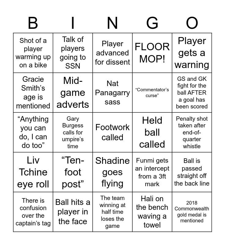 This bingo card has 36 words: Free!, Alicia Scholes feeds from the centre third, “Another bite of the cherry”, Mid-game adverts, Funmi gets an intercept from a 3ft mark, Liv Tchine eye roll, Nat Panagarry sass, Scoreboard / time / feed drops out., Player gets a warning, Player gets a suspension, Gary Burgess calls for umpire’s time, FLOOR MOP!, Short pass called, Held ball called, GS and GK fight for the ball AFTER a goal has been scored, Shot of a player warming up on a bike, 2018 Commonwealth gold medal is mentioned, “Ten-foot post”, Footwork called, Player advanced for dissent, Penalty shot taken after end-of-quarter whistle, Ball is passed straight off the back line, Ball hits a player in the face, There is confusion over the captain’s tag, The team winning at half time loses the game, Talk of players going to SSN, “Anything you can do, I can do too”, Number of deflections Funmi has made is mentioned, “Commentator’s curse”, Gracie Smith’s age is mentioned, Eboni Usuro-Brown says “the likes of” 5 times, “Learnings”, Hali on the bench waving a towel, Shadine goes flying, “Joseph to Wallace-Joseph” is said after Hannah feeds Sammy and Ella Clark playing basketball for England is mentioned.