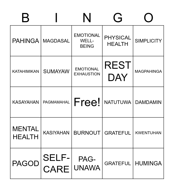 This bingo card has a free space and 26 words: BURNOUT, GRATEFUL, EMOTIONAL EXHAUSTION, SELF-CARE, SIMPLICITY, PAHINGA, KATAHIMIKAN, MAGDASAL, DAMDAMIN, GRATEFUL, REST DAY, KASAYAHAN, KWENTUHAN, PAGOD, PAGMAMAHAL, CARING, PHYSICAL HEALTH, MENTAL HEALTH, EMOTIONAL WELL-BEING, HUMINGA, MAGPAHINGA, PAG-UNAWA, NATUTUWA, KASIYAHAN, SUMAYAW and STRESS.