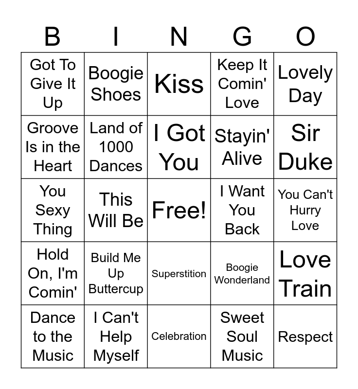 This bingo card has a free space and 45 words: Shining Star, Respect, That's the Way, Dance to the Music, Play That Funky Music, Sweet Soul Music, Kiss, Signed, Sealed, Delivered, Lovely Day, I Can't Help Myself, Keep It Comin' Love, I Want You Back, Superstition, Build Me Up Buttercup, Ain't No Mountain High Enough, Celebration, Don't Stop 'Til You Get Enough, You Sexy Thing, Let's Groove, Sir Duke, Boogie Shoes, ABC, Best of My Love, Got To Give It Up, Get Down On It, You Can't Hurry Love, Low Rider, Get Up Offa That Thing, Boogie Wonderland, Hold On, I'm Comin', Get Down Tonight, Love Train, I Wish, Do You Love Me, Forget Me Nots, This Will Be, Got to Be Real, Rhythm of the Night, Word Up, I Got You, Groove Is in the Heart, Stayin' Alive, Give It To Me Baby, Land of 1000 Dances and Right Back Where We Started From.