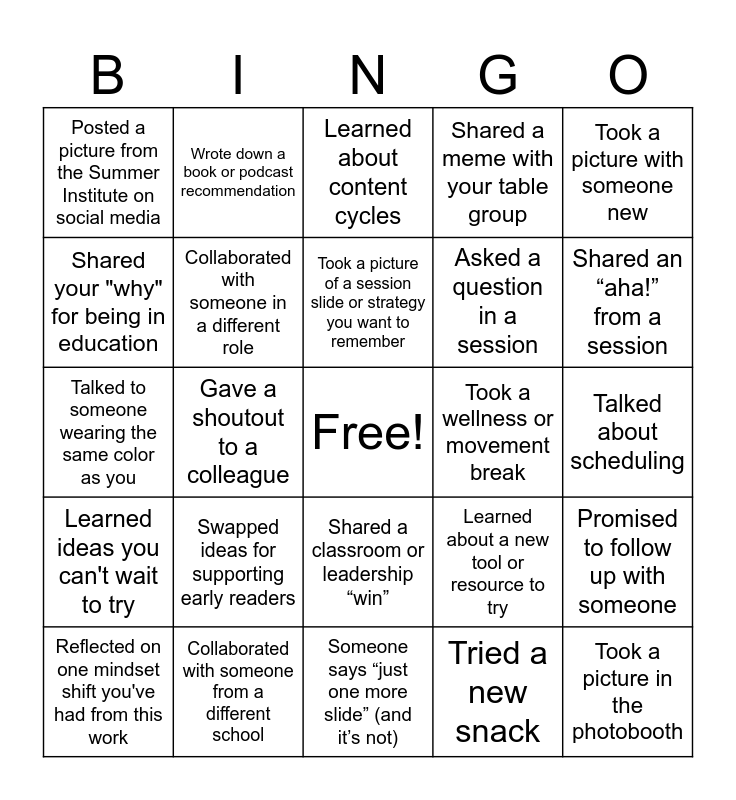 This bingo card has a free space and 24 words: Swapped ideas for supporting early readers, Collaborated with someone from a different school, Took a picture of a session slide or strategy you want to remember, Reflected on one mindset shift you've had from this work, Took a picture with someone new, Posted a picture from the Summer Institute on social media, Shared your "why" for being in education, Wrote down a book or podcast recommendation, Took a wellness or movement break, Shared a classroom or leadership “win”, Asked a question in a session, Talked to someone wearing the same color as you, Learned about a new tool or resource to try, Promised to follow up with someone, Collaborated with someone in a different role, Tried a new snack, Talked about scheduling, Learned about content cycles, Shared an “aha!” from a session, Gave a shoutout to a colleague, Took a picture in the photobooth, Learned ideas you can't wait to try, Shared a meme with your table group and Someone says “just one more slide” (and it’s not).