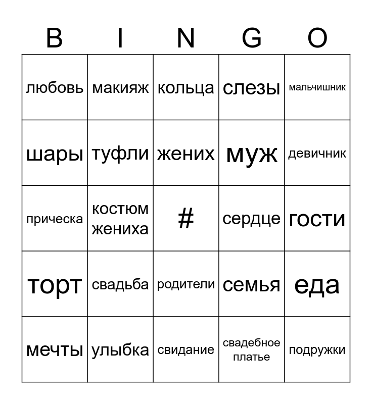 This bingo card has a free space and 42 words: невеста, жених, фата, свадьба, свадебное платье, еда, подружки, подарки, кольца, родители, гости, девичник, костюм жениха, мальчишник, напитки, семья, дети, прическа, песни, макияж, шары, цветы, букет, любовь, гости, жена, муж, фото, виедо, счастье, украшение, торт, туфли, свидание, приглашение, мечты, улыбка, сердце, поцелуй, музыка, слезы and свечи.