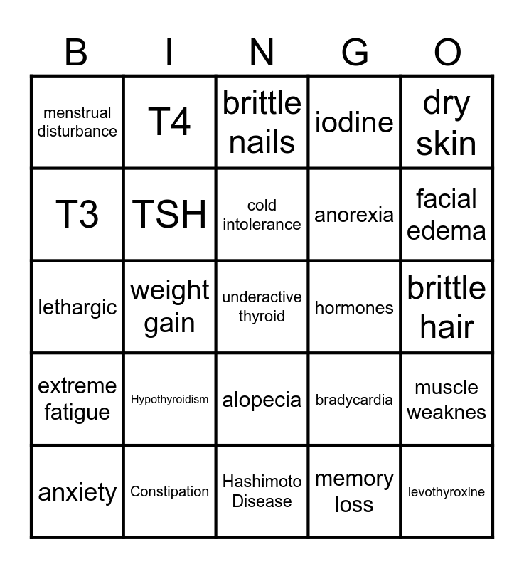 This bingo card has a free space and 24 words: Hypothyroidism, Constipation, cold intolerance, anxiety, dry skin, menstrual disturbance, T3, T4, hormones, alopecia, anorexia, lethargic, bradycardia, muscle weaknes, TSH, memory loss, brittle hair, brittle nails, facial edema, weight gain, levothyroxine, extreme fatigue, iodine and Hashimoto Disease.