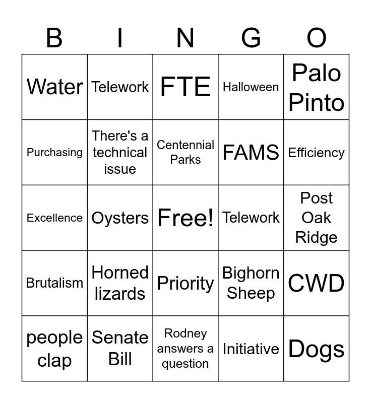 This bingo card has a free space and 29 words: people clap, Tim Timmerman, Oysters, LAR, Water, FTE, There's a technical issue, Horned lizards, Telework, Senate Bill, Post Oak Ridge, Dogs, Rodney answers a question, Initiative, Efficiency, Caverns, Priority, Brutalism, Palo Pinto, Excellence, Bighorn Sheep, People laugh, FAMS, Purchasing, Halloween, Telework, CWD, Centennial Parks and Water.