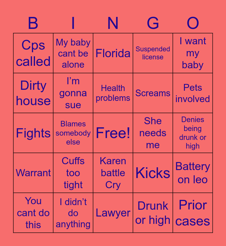 This bingo card has a free space and 24 words: Cuffs too tight, I didn’t do anything, Health problems, You cant do this, I want my baby, Cps called, Dirty house, My baby cant be alone, She needs me, Karen battle Cry, Screams, Fights, Kicks, Battery on leo, I’m gonna sue, Drunk or high, Denies being drunk or high, Florida, Pets involved, Blames somebody else, Prior cases, Warrant, Suspended license and Lawyer.