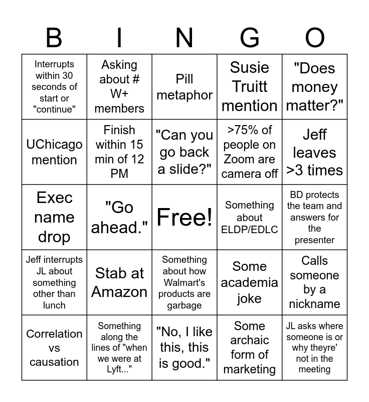 This bingo card has a free space and 24 words: Stab at Amazon, Something along the lines of "when we were at Lyft...", "Can you go back a slide?", Correlation vs causation, "Does money matter?", Interrupts within 30 seconds of start or "continue", UChicago mention, Asking about # W+ members, Something about ELDP/EDLC, Something about how Walmart's products are garbage, >75% of people on Zoom are camera off, Exec name drop, Some academia joke, Calls someone by a nickname, Finish within 15 min of 12 PM, Some archaic form of marketing, BD protects the team and answers for the presenter, Pill metaphor, Jeff leaves >3 times, "Go ahead.", JL asks where someone is or why theyre' not in the meeting, Jeff interrupts JL about something other than lunch, Susie Truitt mention and "No, I like this, this is good.".