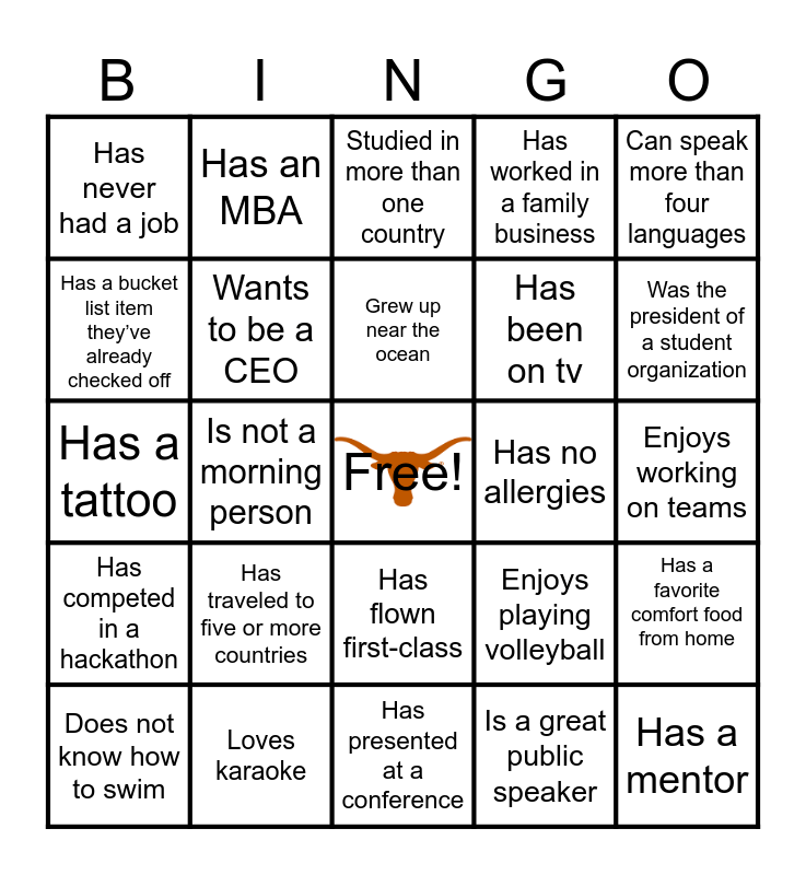 This bingo card has a free space and 24 words: Has traveled to five or more countries, Loves karaoke, Grew up near the ocean, Does not know how to swim, Can speak more than four languages, Has never had a job, Has a bucket list item they’ve already checked off, Has an MBA, Has no allergies, Has flown first-class, Has been on tv, Has a tattoo, Enjoys playing volleyball, Has a favorite comfort food from home, Wants to be a CEO, Is a great public speaker, Enjoys working on teams, Studied in more than one country, Was the president of a student organization, Is not a morning person, Has a mentor, Has competed in a hackathon, Has worked in a family business and Has presented at a conference.