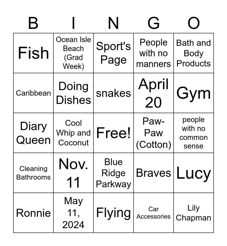 This bingo card has a free space and 24 words: Nov. 11, May 11, 2024, snakes, Ronnie, Bath and Body Products, Fish, Caribbean, Ocean Isle Beach (Grad Week), Paw- Paw (Cotton), Blue Ridge Parkway, April 20, Diary Queen, Braves, Lucy, Doing Dishes, Car Accessories, people with no common sense, Sport's Page, Gym, Cool Whip and Coconut, Lily Chapman, Cleaning Bathrooms, People with no manners and Flying.