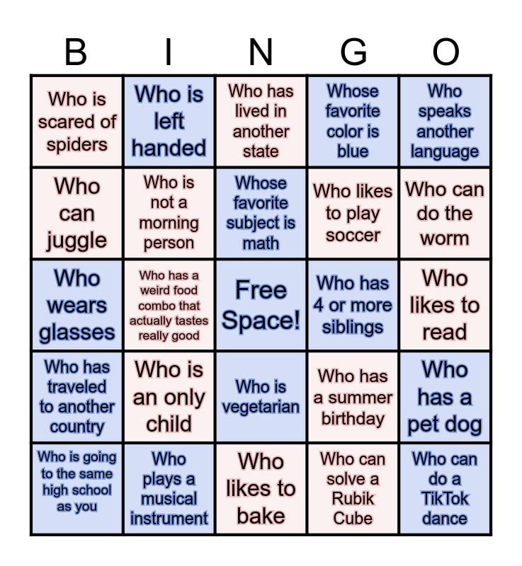 This bingo card has a free space and 24 words: Who is going to the same high school as you, Who is an only child, Whose favorite subject is math, Who can solve a Rubik Cube, Who speaks another language, Who is scared of spiders, Who is left handed, Who has lived in another state, Who has 4 or more siblings, Who likes to read, Who wears glasses, Who is not a morning person, Who has a summer birthday, Who has a pet dog, Who can juggle, Who plays a musical instrument, Who likes to bake, Whose favorite color is blue, Who can do the worm, Who has traveled to another country, Who has a weird food combo that actually tastes really good, Who is vegetarian, Who likes to play soccer and Who can do a TikTok dance.