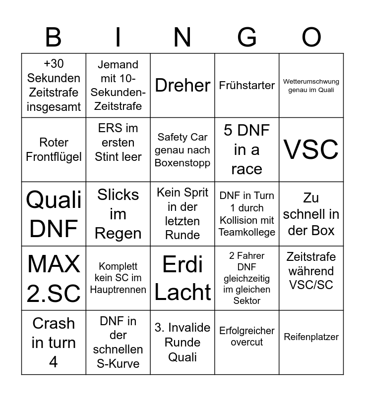 This bingo card has a free space and 24 words: Crash in turn 4, Komplett kein SC im Hauptrennen, Safety Car genau nach Boxenstopp, Erfolgreicher overcut, Wetterumschwung genau im Quali, +30 Sekunden Zeitstrafe insgesamt, Jemand mit 10-Sekunden-Zeitstrafe, Dreher, DNF in Turn 1 durch Kollision mit Teamkollege, Zu schnell in der Box, Quali DNF, ERS im ersten Stint leer, 2 Fahrer DNF gleichzeitig im gleichen Sektor, Zeitstrafe während VSC/SC, Roter Frontflügel, DNF in der schnellen S-Kurve, 3. Invalide Runde Quali, Frühstarter, VSC, MAX 2.SC, Slicks im Regen, Erdi Lacht, 5 DNF in a race and Reifenplatzer.