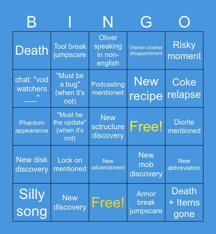 This bingo card has a free space and 24 words: Lock on mentioned, New discovery, Podcasting mentioned, Silly song, Risky moment, Death, chat: "vod watchers ___", Tool break jumpscare, Free!, New advancement, New recipe, Phantom appearance, New mob discovery, New abbreviation, "Must be a bug" (when it's not), Armor break jumpscare, Diorite mentioned, Oliver speaking in non-english, Coke relapse, "Must be the update" (when it's not), Death + Items gone, New disk discovery, Orphan crusher disappointment and Free!.