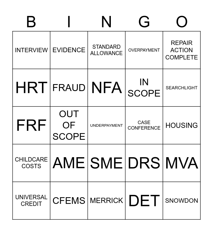 This bingo card has 38 words: Free!, CFCD, ERT, FRAUD, MVA, AME, NFA, CLOSED AFTER CFCD INTERVENTION, REPAIR ACTION COMPLETE, IN SCOPE, OUT OF SCOPE, OVERPAYMENT, UNDERPAYMENT, HOUSING, HRT, CHILDCARE COSTS, HOUSING COSTS, STANDARD ALLOWANCE, DECISION MAKER, CASE CONFERENCE, INTERVIEW, CFEMS, SEARCHLIGHT, UNIVERSAL CREDIT, SCAFELL, MERRICK, SNOWDON, CBOL, ENIRS, LAND REGISTRY, COMPANIES HOUSE, SME, DET, EVIDENCE, SUSPENSION, DRS, FRF and NINO.