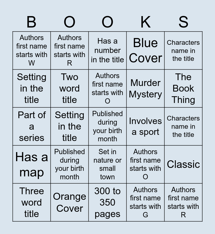 ⚠ This card has duplicate items: Person on the cover (3), Murder Mystery (3), Authors first name starts with I (2), Setting in the title (2), Part of a series (2), Authors first name starts with W (2), Published during your birth month (2), Characters name in the title (2), Takes place next to a body of water (2), Authors first name starts with O (2), Involves a sport (2), Has a number in the title (2), Three word title (2), Classic (2), Set in nature or small town (2), 300 to 350 pages (2), 500 to 550 pages (2), The Book Thing (2), New release (2025) (2), Authors first name starts with S (2), Has a one word title (2), Yellow Cover (2), Fantasy (2), Authors first name starts with R (2), Inspiring, Uplifting, hopeful (2)