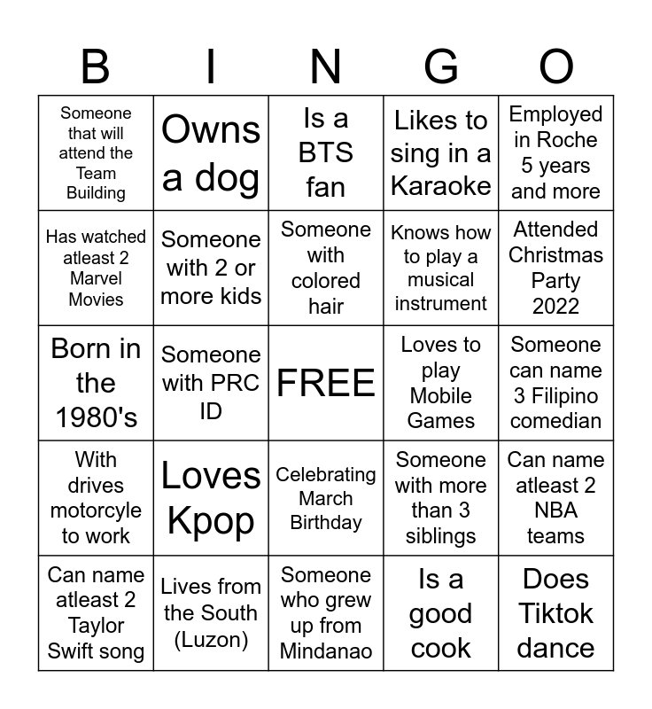 This bingo card has a free space and 24 words: Loves Kpop, Lives from the South (Luzon), Someone with colored hair, Can name atleast 2 Taylor Swift song, Employed in Roche 5 years and more, Someone that will attend the Team Building, Has watched atleast 2 Marvel Movies, Owns a dog, Loves to play Mobile Games, Celebrating March Birthday, Knows how to play a musical instrument, Born in the 1980's, Someone with more than 3 siblings, Can name atleast 2 NBA teams, Someone with 2 or more kids, Is a good cook, Someone can name 3 Filipino comedian, Is a BTS fan, Attended Christmas Party 2022, Someone with PRC ID, Does Tiktok dance, With drives motorcyle to work, Likes to sing in a Karaoke and Someone who grew up from Mindanao.