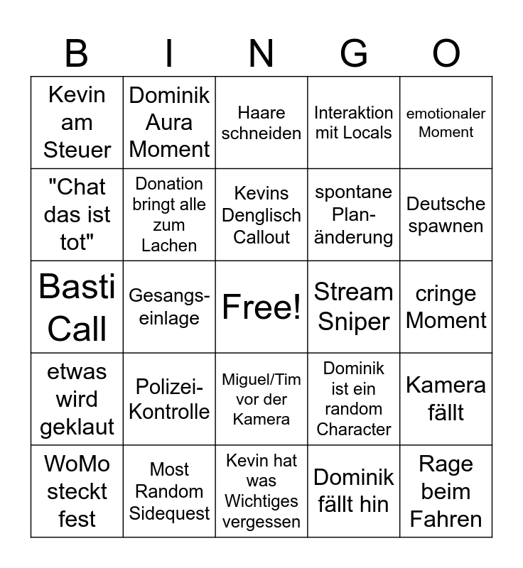 This bingo card has a free space and 24 words: Polizei-Kontrolle, Most Random Sidequest, Kevins Denglisch Callout, WoMo steckt fest, emotionaler Moment, Kevin am Steuer, "Chat das ist tot", Dominik Aura Moment, Stream Sniper, Miguel/Tim vor der Kamera, spontane Plan-änderung, Basti Call, Dominik ist ein random Character, Kamera fällt, Donation bringt alle zum Lachen, Dominik fällt hin, cringe Moment, Haare schneiden, Deutsche spawnen, Gesangs-einlage, Rage beim Fahren, etwas wird geklaut, Interaktion mit Locals and Kevin hat was Wichtiges vergessen.