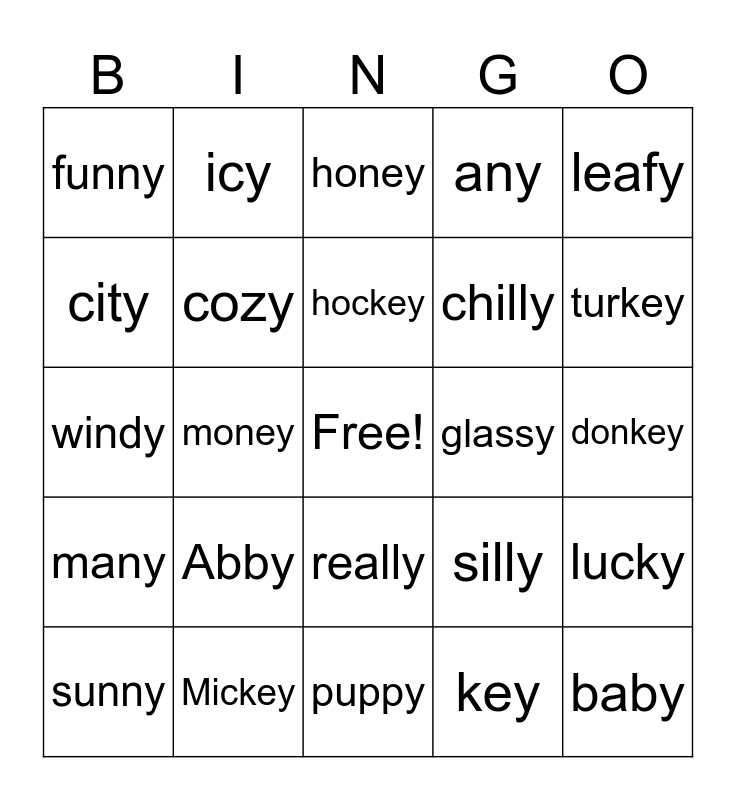 This bingo card has a free space and 24 words: Abby, Mickey, hockey, sunny, leafy, funny, city, icy, glassy, really, chilly, windy, silly, lucky, cozy, key, donkey, honey, turkey, money, baby, many, any and puppy.