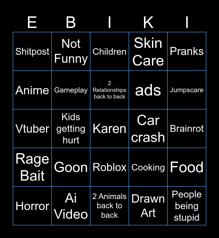 This bingo card has 25 words: Goon, 2 Animals back to back, 2 Relationships back to back, Horror, Pranks, Shitpost, Anime, Not Funny, Car crash, Roblox, ads, Vtuber, Cooking, Food, Gameplay, People being stupid, Brainrot, Children, Jumpscare, Kids getting hurt, Karen, Ai Video, Rage Bait, Skin Care and Drawn Art.