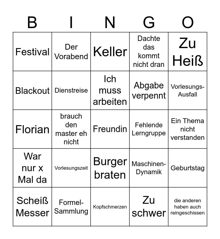 This bingo card has a free space and 24 words: Scheiß Messer, Vorlesungszeit, Ich muss arbeiten, Zu schwer, Zu Heiß, Festival, Der Vorabend, Keller, Fehlende Lerngruppe, Ein Thema nicht verstanden, Florian, Dienstreise, Maschinen-Dynamik, Geburtstag, Blackout, Formel-Sammlung, Kopfschmerzen, Dachte das kommt nicht dran, Vorlesungs-Ausfall, War nur x Mal da, brauch den master eh nicht, Burger braten, Abgabe verpennt and die anderen haben auch reingeschissen.