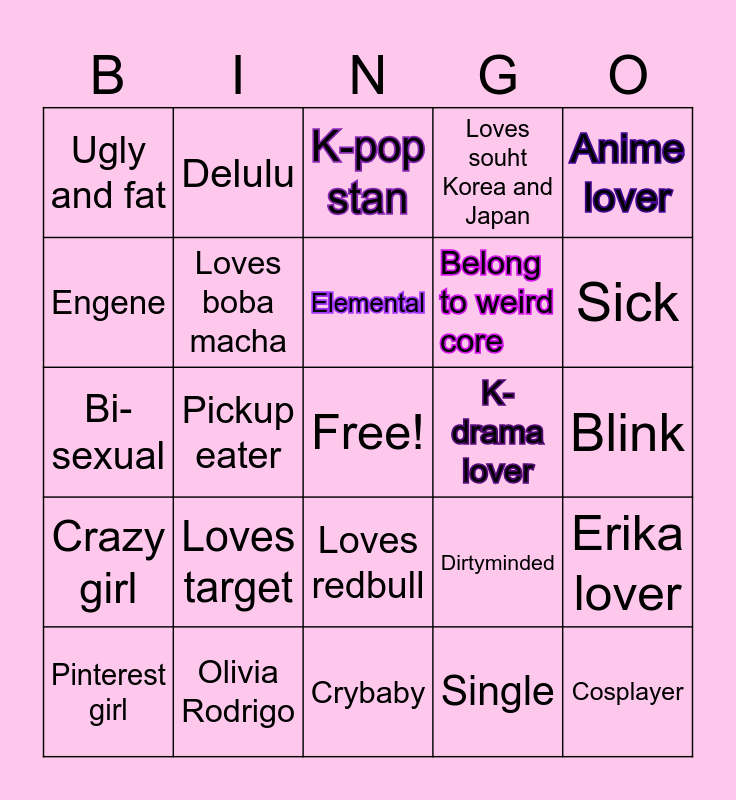 This bingo card has a free space and 24 words: Loves target, Olivia Rodrigo, Elemental, Pinterest girl, Anime lover, Ugly and fat, Engene, Delulu, K-drama lover, Loves redbull, Belong to weird core, Bi-sexual, Dirtyminded, Erika lover, Loves boba macha, Single, Blink, K-pop stan, Sick, Pickup eater, Cosplayer, Crazy girl, Loves souht Korea and Japan and Crybaby.