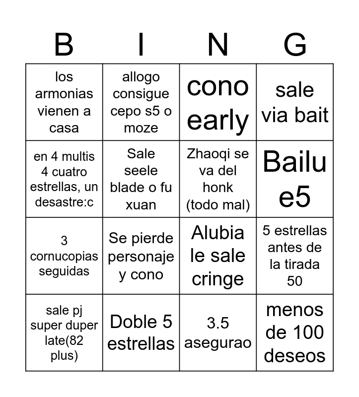 This bingo card has 16 words: Doble 5 estrellas, 5 estrellas antes de la tirada 50, cono early, los armonias vienen a casa, 3 cornucopias seguidas, allogo consigue cepo s5 o moze, Alubia le sale cringe, 3.5 asegurao, en 4 multis 4 cuatro estrellas, un desastre:c, Sale seele blade o fu xuan, sale pj super duper late(82 plus), sale via bait, Se pierde personaje y cono, Bailu e5, Zhaoqi se va del honk (todo mal) and menos de 100 deseos.