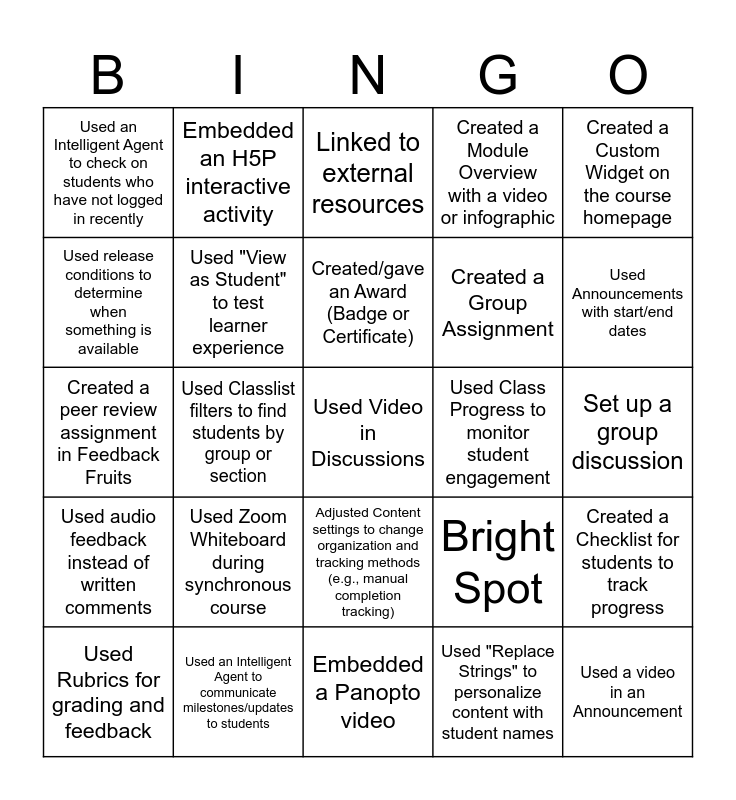 This bingo card has 25 words: Used Zoom Whiteboard during synchronous course, Embedded a Panopto video, Created/gave an Award (Badge or Certificate), Used Rubrics for grading and feedback, Created a Custom Widget on the course homepage, Used an Intelligent Agent to check on students who have not logged in recently, Used release conditions to determine when something is available, Embedded an H5P interactive activity, Used Class Progress to monitor student engagement, Adjusted Content settings to change organization and tracking methods (e.g., manual completion tracking), Created a Group Assignment, Created a peer review assignment in Feedback Fruits, Bright Spot, Created a Checklist for students to track progress, Used "View as Student" to test learner experience, Used a video in an Announcement, Set up a group discussion, Linked to external resources, Used Announcements with start/end dates, Used Classlist filters to find students by group or section, Used Video in Discussions, Used an Intelligent Agent to communicate milestones/updates to students, Used audio feedback instead of written comments, Created a Module Overview with a video or infographic and Used "Replace Strings" to personalize content with student names.